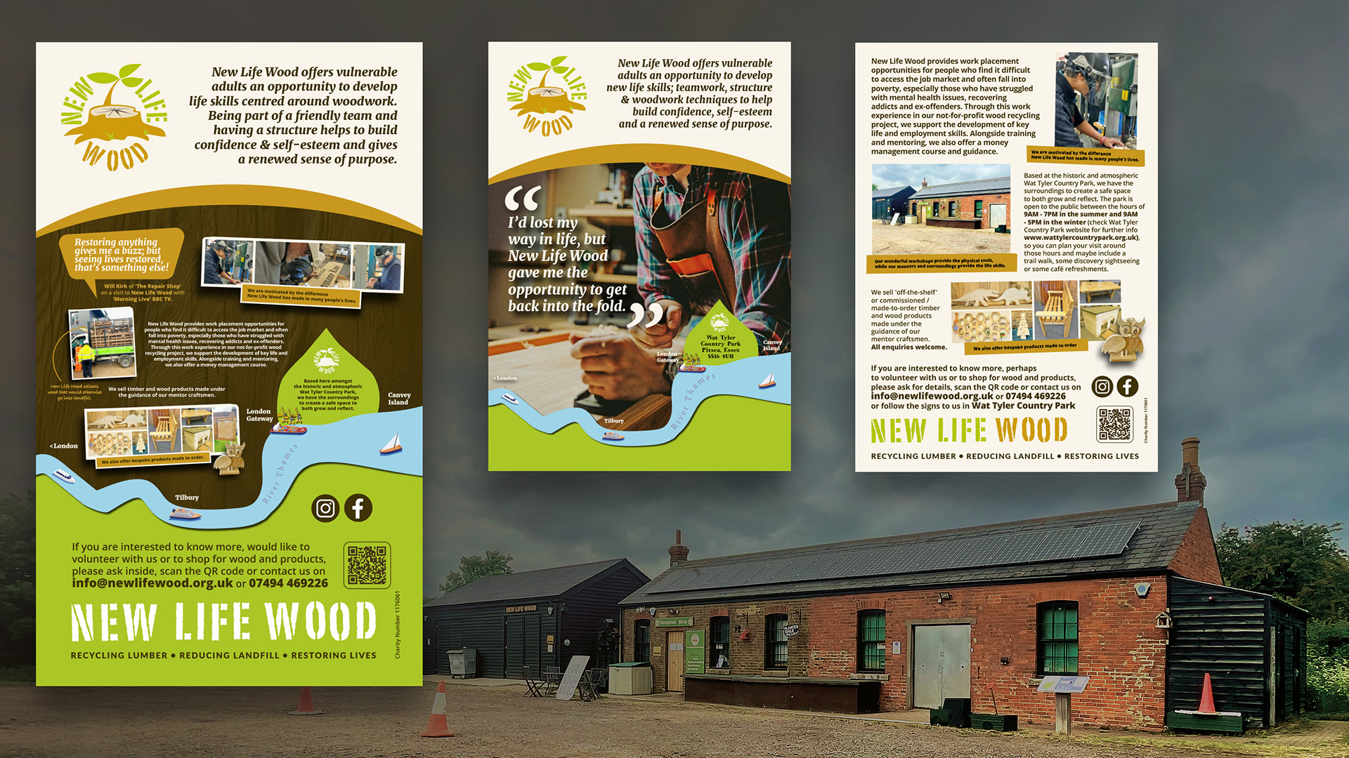 New Life Wood are a registered charity based in the Wat Tyler Country Park working to change lives by helping to relieve unemployment and poverty through wood and carpentry skills. They were looking for a brand overhaul to create consistent visual messaging across all their channels. It needed to appeal to professionals and the public alike so a combination of fact-based content with some playful imagery was used to capture and retain attention. Here are an outside information board based in the park and also the front and reverse of an A5 information leaflet.
